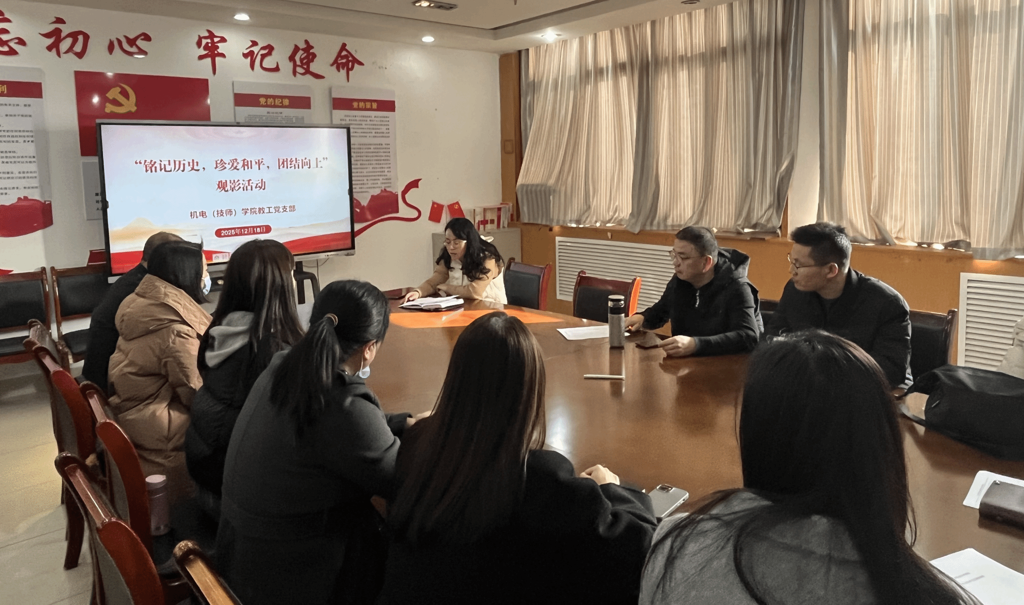为深化爱国主义教育,厚植家国情怀,引导党员铭记历史、珍爱和平、砥砺奋进,2025年12月18日下午2:30,公司教工党支部在1号教学楼1113会议室开展“铭记历史,珍爱和平,团结向上”主题观影活动,支部全体党员参加。