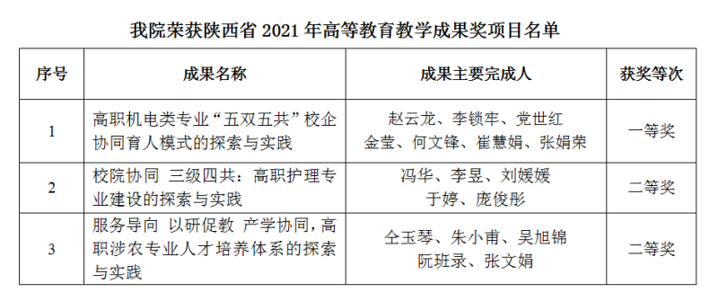 近日,陕西省人民政府公布了《关于表彰陕西省2021年高等公司产品成果奖获奖项目的通报》(陕政办函〔2022〕64号),公司3项教学成果荣获省级教学成果奖。其中赵云龙教授主持的《高职机电类专业“五双五共”校企协同育人模式的探索与实践》荣获一等奖,冯华教授主持的《校院协同 三级四共:高职护理专业建设的探索与实践》、仝玉琴教授主持的《服务导向 以研促教 产学协同,高职涉农专业人才培养体系的探索与实践》等2项成果荣获二等奖。