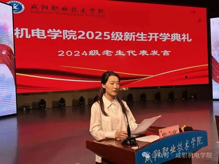 老生代表2024级数控技术专业杨媛同学分享了自己在学院的学习和生活经历,鼓励学弟学妹们要积极参加各种活动,锻炼自己的能力,同时要合理安排时间,平衡好学习和生活。