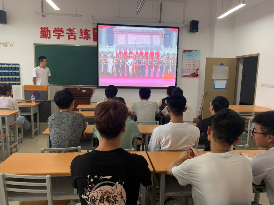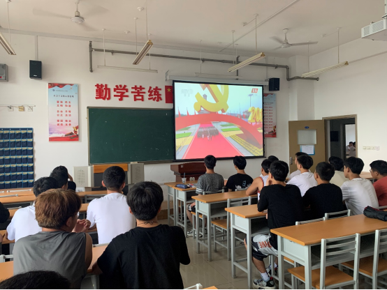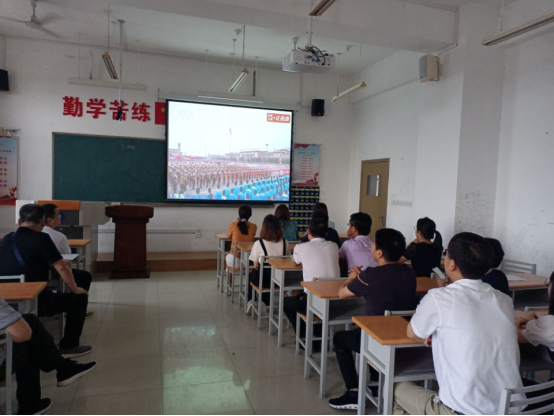 伴随着雄壮的国歌,鲜艳的五星红旗冉冉升起,全体师生党员们对着屏幕向庄严的五星红旗行注目礼、跟唱国歌。100响礼炮,声声震寰宇;100步的齐步正步走,步步坚定有力!“中华民族迎来了从站起来、富起来到强起来的伟大飞跃,实现中华民族伟大复兴进入了不可逆转的历史进程!”习近平代表党和人民做出的庄严宣告,慷慨激昂,振奋人心。